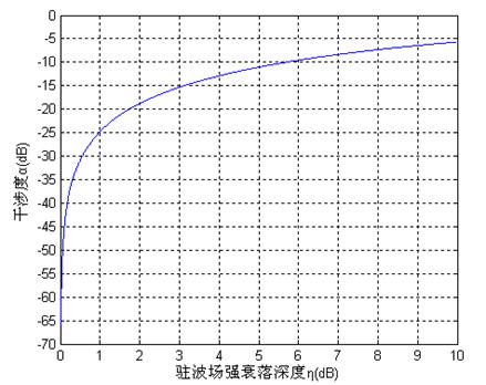 电视接收机具有自动增益控制(AGC)功能,其控制能力约60dB70dB,只要合成场强的变化范围(即:驻波衰落深度η)在AGC的作用范围内,由于载频的微小频差导致驻波相位漂移所产生的接收信号场强波动即可以被抑制。干涉度α与驻波场强衰落深度η关系见下图。