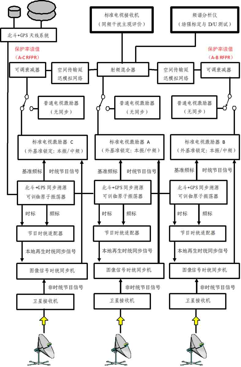 电视精密同步广播保护率实验平台为三通道模拟系统。通过射频混合器对三路发射机的射频输出信号叠加,实现空间电波混叠的模拟。其中,模拟两路干扰信号的发射机,输出端接有精密可调射频衰减器和精密可设定空间传输延迟网络,模拟空间电波的传输衰耗和传输延迟,精确地再现等场强交叠覆盖区的合成驻波场强分布及偏离等场强区一定距离内的电视精密同步广播合成信号。三路发射机的输出电平,在混合器输出端经过标定后,衰减器的读值,实际就是射频保护率数值。电视精密同步广播试验发射机的载频(图像中频与上变频本振),锁定于北斗/GPS双路径溯源同步的铷原子基准源,实现了三路模拟发射机射频载频的精密同步。图像节目信号,则经过程图像信号时统同步机重构时基同步序列,将行/场相位精确同步于北斗/GPS溯源的UTC标准时间的1PPS。实现了三路模拟发射机节目信号的精确时统同步。不同发射机的节目图像信号取自于完全独立的卫星接收链路。各路卫星接收机输出的节目信号之间,存在着严重的行/场相位摄动(卫星接收机解码器初始状态的随机性造成)以及行频与场频偏差(卫星接收机PAL编码器的时基误差造成)。其节目信号特征,已非常接近工程实际。