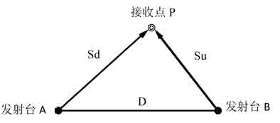 同频道工作的两部电视发射机,在它们的共同覆盖区内,有任意接收点PP点与主收发射机(A)的距离为SdP点与干扰发射机(B)的距离为Su。当两部发射机同步工作时,即载频相对频差F0时,两部发射机的载波在接收点P的相位差: