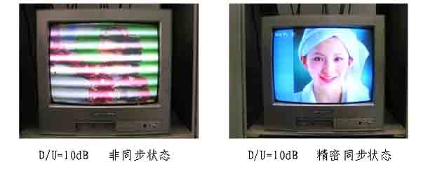 经过电视节目信号时统均衡的电视精密同步广播系统,在D/U=0dB的完全等场强区接收电视图像,其干扰“鬼影”与欲收图像是重合的,这种“鬼影”的干扰几乎不可见。随着接收点偏离等场强区,“鬼影”与图像逐渐错位,但由于这种“鬼影”是静止的,其敏感性极低。随着偏离等场强区距离愈远,D/U亦随之提高,“鬼影”亦在随之变淡。干扰“鬼影”与欲收图像锁定了时序相关性后,在原来单纯的图像载频锁定的基础上,可以进一步改善射频保护率约12dB,即降低至RFPR=10dB