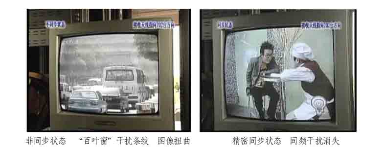 电视精密同步广播的核心技术:①精密锁定各同步发射机的图像载频,消除图像载频差拍形成的“百叶窗”条纹干扰;②精确同步各发射台节目图像的行/场频率,使运动的“鬼影”静止下来变成“重影”。并且通过时统均衡控制,让各发射台节目图像的行/场相位在完全等场强交叠覆盖区一致,将接收的图像信号与干扰“鬼影”完全重合。