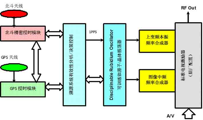 电视精密同步广播,同步发射机的图像载频和节目图像的时统均衡控制,需要高精度时间与频率的同步。在工程实践中,是通过GPS授时系统的溯源获得10MHz频率基准和1PPS时间基准。