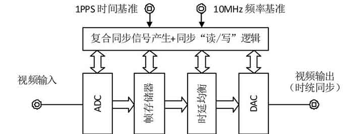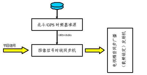 电视精密同步广播图像信号的时统同步,是在电视同步广播适配器中完成。通过不同路径传输至各同步发射台的图像节目信号,经由电视同步广播适配器的数字化处理和存贮,将图像信号的帧相位和行相位与1PPS和10MHz时钟进行严格的粘滞同步,从而实现各同步发射台之间图像节目信号的时统同步。