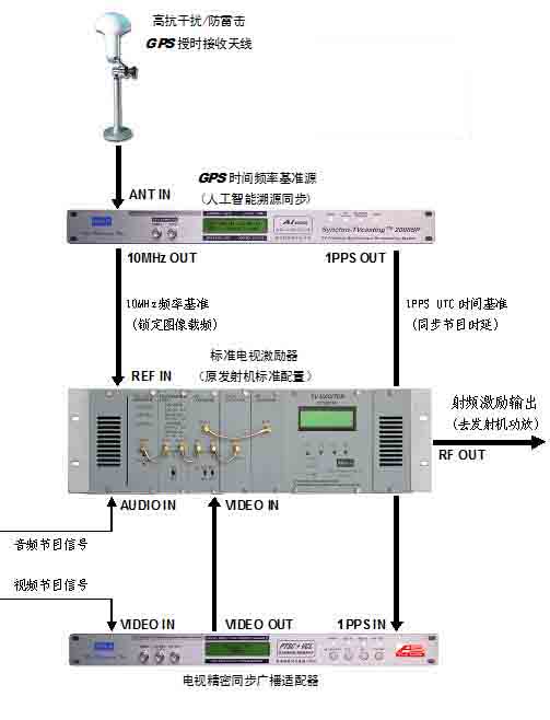 电视精密同步广播专用设备包括: GPS精密时频基准源和电视同步广播适配器。目前,电视发射机的主流制造商均能够提供该设备的配套。