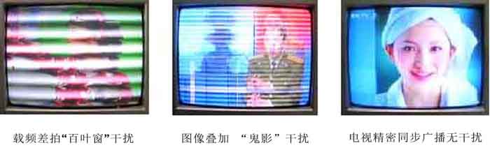 电视同频干扰的研究实践证明:电视同频干扰对接收图像的损伤来自两个方面:①同频台之间图像载波频差形成的拍频干扰,即接收图像上的“百叶窗”滚动条纹干扰;②同频台之间的图像内容相互叠加,因图像信号行/场频率与相位的不同步,形成运动的“鬼影”。