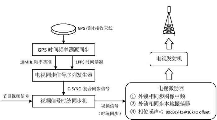 10MHz频率基准和1PPS时间基准,在电视同步信号序列发生器中,合成出各发射台严格同步的电视复合同步信号。该电视复合同步信号再在时统同步机中重新构建节目视频信号的时基,从而实现各同步发射台图像信号的时统同步。