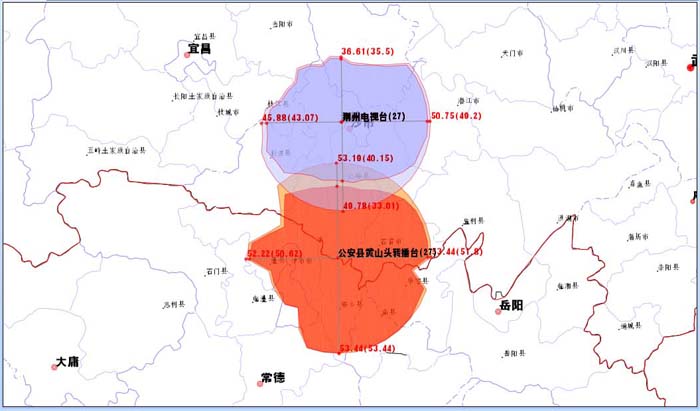 荆州电视台,现有DS-27荆州发射台,功率10kw(北广发射机),天线基础海拔37米,天线挂高170米,天线增益10dBi。为解决荆州南部地区的无线电视覆盖,拟在荆州以南80Km的黄山头设立同步发射台进行延伸覆盖。新建的黄山头同步发射台,功率5kw(吉兆发射机),天线基础海拔和挂高分别为265米和70米,天线增益10dBi。根据国家广电总局科技委《关于加快实施电视精密同步广播》建议书(第7-4-7号)和广播科学研究院的《电视精密同步广播技术白皮书》推荐的技术参数,电视精密同步广播所需的射频同频保护率为10dB(电视接收机天线端口电平的保护率)。而实际的覆盖中,在ED/EU=0dB的完全等场强区,计及接收天线的方向选择性(F/B≈8~16dB)后,能够获得LD/LU→10dB的等效同频道射频保护率。所以,电视精密同步广播的等场强交叠覆盖区是能够提供有效覆盖的。