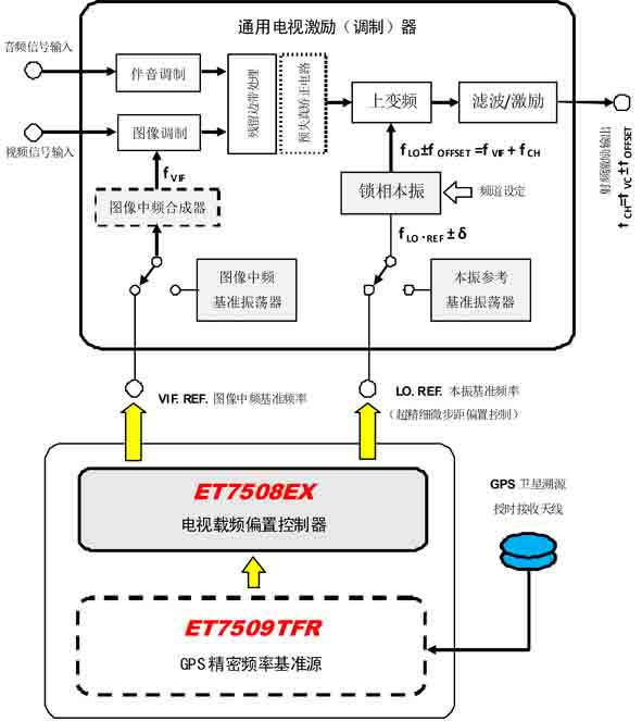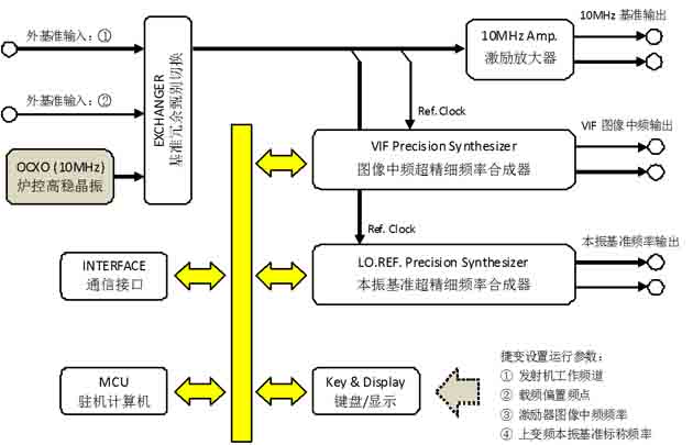 电视发射机要实现载频偏置控制,必须对电视调制器中的图像中频和上变频本振进行精确锁定和偏置控制。通过对上变频本振的参考基准频率作微步距的精密偏置控制,即可实现发射载频的精密频率偏置控制。