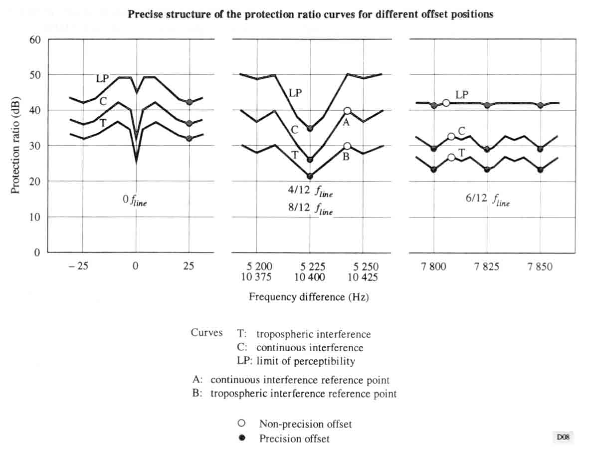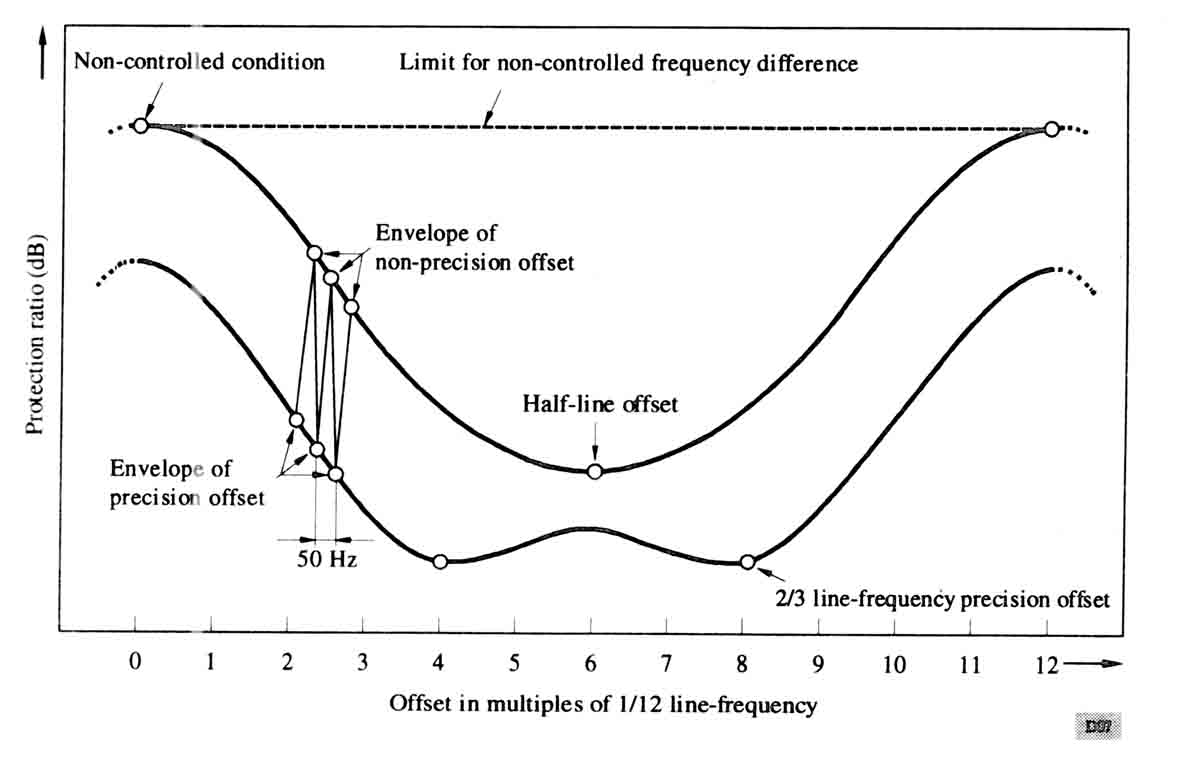 非精密载频偏置的最佳偏置频点为6/12行频,其同频道射频保护率为27dB(超视距对流层干扰)/33dB(视距内连续稳定干扰)。精密载频偏置的最佳偏置频点为4/12和8/12行频,其同频道射频保护率为22dB(超视距对流层干扰)/27dB(视距内连续稳定干扰)。载频偏差与同频道保护率的函数规律在�36/12行频周期内具有相同的延展性。依据国际电联ITU-R